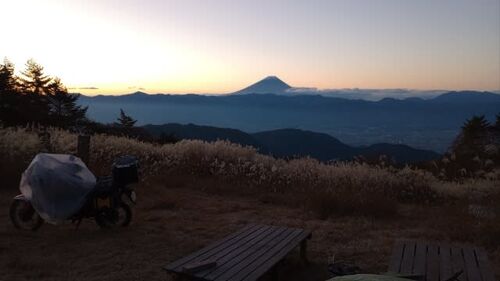 晴れ、気温10/マイナス5度6時起床。外に出ると富士山が見えた!!テント内は2度。寝ている分には、全然寒くは無いですけどね。バイク温度計はマイナス5度。流石に霜が降りてる。コーヒー淹れてると山頂にも日が当ってきた。東側に松の茂みがあるんで…